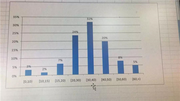 无锡公交线路里程数比例示意图(横轴为里程数,竖轴为线路占比比例)