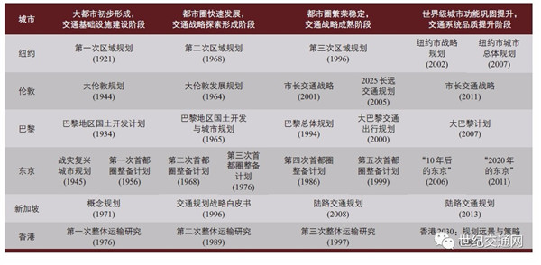 (1)制定城市交通战略的需求往往在城市开始进入都市圈快速发展阶段后才产生。六大世界级城市在发展初期均只有城市发展战略规划,并未制订专门的交通发展战略规划。随着城市的不断发展,在进入都市圈快速发展阶段之后,都无一例外地制定了专门的交通发展战略(或者在城市总体规划中给予专项研究),以引导和支撑城市的有序扩张。