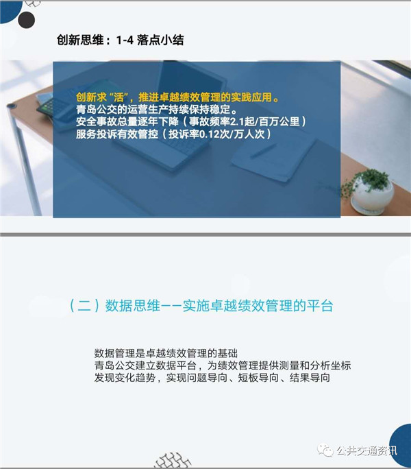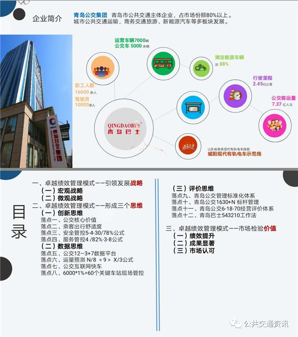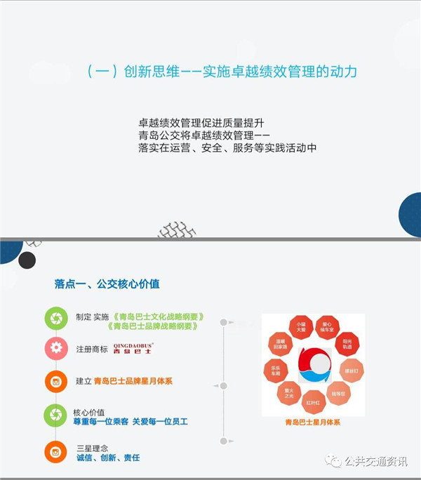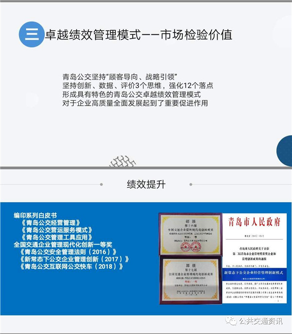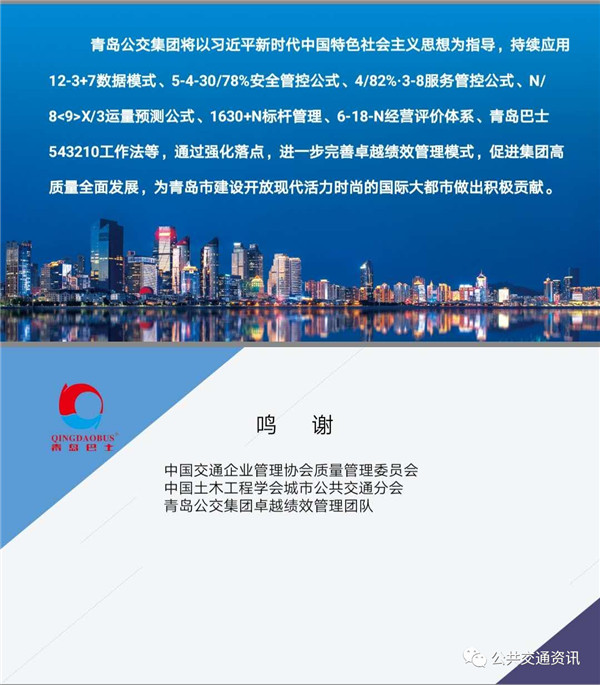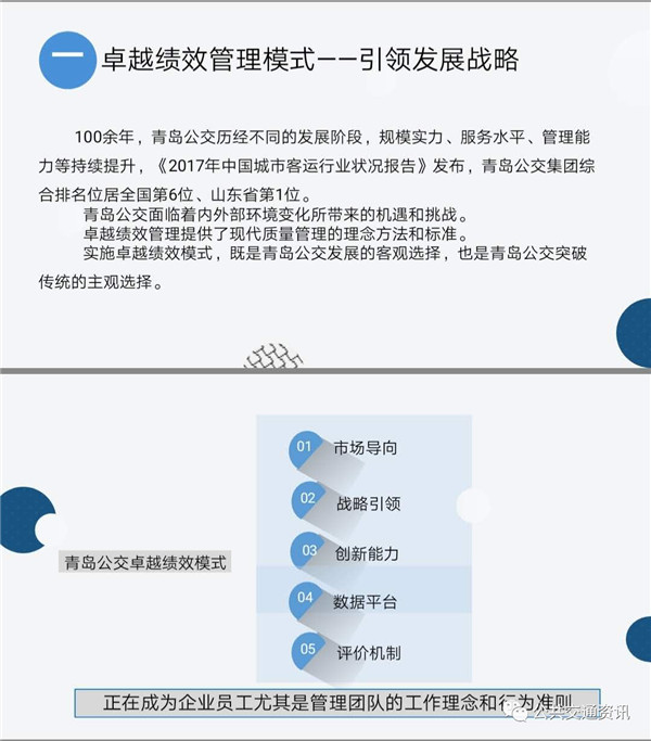 青岛公交管理团队在实施卓越绩效管理的过程中,形成了“市场导向+战略引领+创新能力+数据平台+评价机制”为主要素的青岛公交卓越绩效模式,正在成为企业员工尤其是管理团队的工作理念和行为准则。