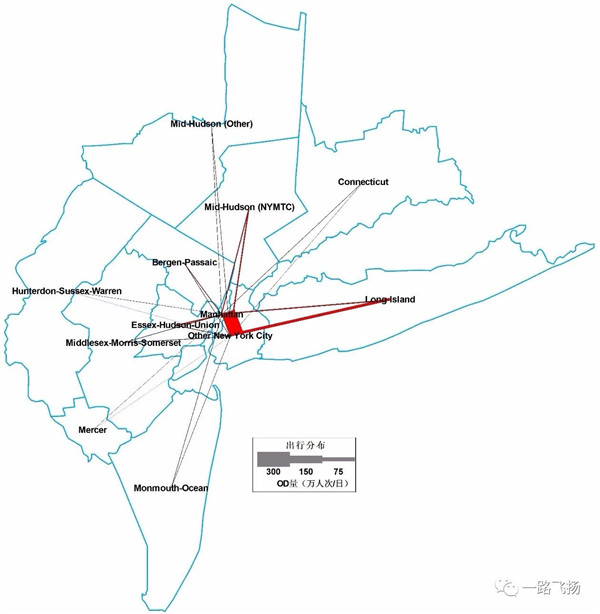 纽约都市圈日出行总量为7948万人次,80%以上出行为区内出行;每天进出纽约市的出行量为272万人次,占总出行量的3.4%;纽约市内部出行量为2565万人次,占总出行量的32.3%;纽约市外围组团内出行量为5108万人次,占总出行量的64.3%。