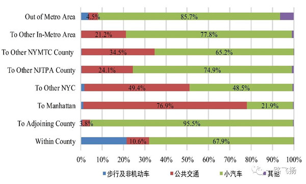 曼哈顿公共交通出行分担率约30.6%,步行及非机动车出行分担率达56.1%,小汽车出行分担率只有13.2%;但纽约市以外地区公共交通出行分担率多不足10%,而小汽车出行分担率多高达80%以上。