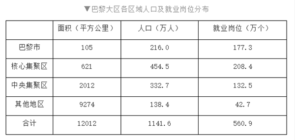巴黎核心集聚区内人口约671万,核心集聚区以外人口约471万,核心集聚区就业岗位溢出约70万个。