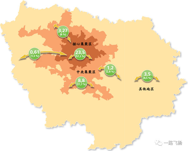 巴黎都市圈日出行总量为4100万人次,80%以上出行为区内出行;巴黎核心集聚区内部出行量为2358万人次,占总出行量的57.5%;每天进出巴黎核心集聚区的出行量为388万人次,占总出行量的9.5%;巴黎核心集聚区外围组团内出行量为1354万人次,占总出行量的33%。