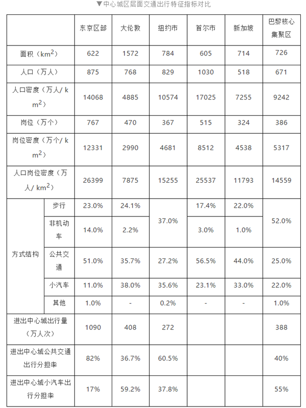 尽管每天进出大伦敦、巴黎核心集聚区的出行量(408万人次和388万人次)远高于每天进出纽约市的出行量(272万人次),但伦敦、巴黎更多是进出外伦敦和除巴黎市以外的核心集聚区(占比达60-70%),这部分出行小汽车主导;因此,伦敦、巴黎进出中心城公共交通出行分担率仅在35-40%左右,远低于纽约、东京的60-80%。源头当然是纽约(曼哈顿)、东京(都心六区)核心区超高的就业岗位密度,而巴黎、伦敦则相对均衡一些。