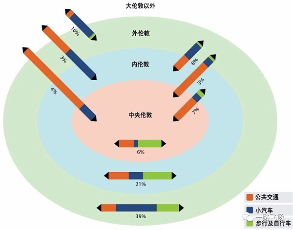 每天进出大伦敦的408万人次出行中,96万人次进出中央伦敦(公共交通占比83%、小汽车占比17%),72万人次进出内伦敦(公共交通占比47%、小汽车占比53%),240万人次进出外伦敦(公共交通占比15%、小汽车占比78%)。
