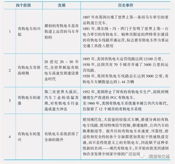 有轨电车自19世纪末发展至今,经历了蓬勃兴起、广泛应用、停滞废弃和重新快速发展4个阶段。(见表1)