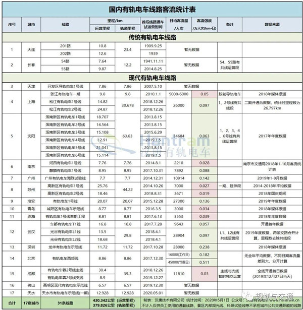 有轨电车在国外得到广泛应用,但在国内的应用尚属于起步阶段。截至2020年5月,中国内地包括沈阳、大连、长春、天津、上海、苏州、南京、青岛、广州、淮安、珠海、武汉、深圳、北京、成都、佛山、天水在内的17个城市的有轨电车已投入运营,共计31条线路,其中沈阳、大连、长春等地是全国最早运营有轨电车的城市。我国有轨电车发展情况如表2所示。