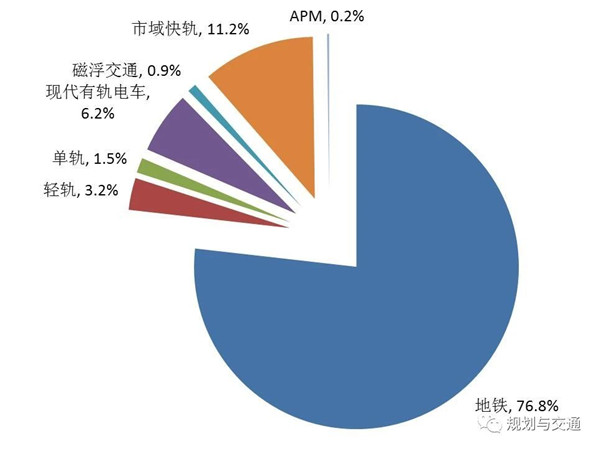 据中国城市轨道交通协会统计,截至2019年末,全国城轨运营里程达6736.2公里,其中地铁为5180.6公里,占比76.8%;轻轨为217.6公里,占比3.2%;单轨98.5公里,占比1.5%;现代有轨电车417公里,占比6.2%;磁浮交通为57.7公里,占比0.9%;市域快轨为754.6公里,占比11.2%;APM为10.2公里,占比0.2%,如图5所示。