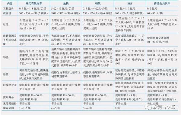 与其他交通制式相比,现代有轨电车以其高效灵活、节能环保、造价运营成本低等特点被广泛应用于各种规模的城市,并取得了良好的交通应用效果。表3列举了几种公共交通的特点对比。