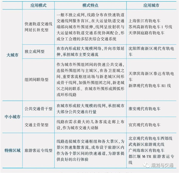 现代有轨电车作为城市公共交通的一种,根据其与城市交通的关系可主要分为骨干型、辅助补充型和旅游特色型,但在实际中还需根据其与城市常规公交、大运量轨道交通、机动车、自行车等运输系统之间的关系,兼顾近期需求和远期发展具体细分,不能笼统地将其作为城市轨道交通的补充和延伸。由于城市规模、城市发展布局,客流特征、有轨电车线网层次以及现代有轨电车的技术经济特征的影响,其不同运用模式在不同城市各有特点,表4为几种典型的应用模式及其特点。
