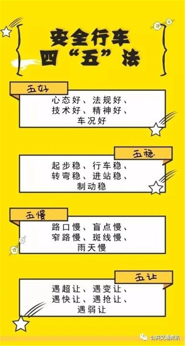 五好:心态好、法规好、技术好、精神好、车况好;